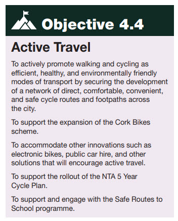 Target Figure . The target figure of 4% is based on CMATS data from 2011 census and this is also a target for the greater Metropolitan Area to 2040 , not the City Boundary Area up to 2028. The figure of 4% is a forecast modelling figure for 2040 CMATS area and not an ambitiuos target for 2028. 4% is also a step backwards from the stated target of 10% by 2020 under the National Cycle Policy Framework. The figure of 4% is very low comapred to second cities and similar size cites in other countries. A target of 20% for Cork is more aligned with our goals for a liveable 15-minute city, Climate Change and Environment Objectives, and a transition to a low carbon sustainable future as stated in the Core Strategy objectives. A stated target of 20% in the Active Travel Objective 4.4 is a measurable, time related and actionable objective that would require a active monitoring and progress reports at regular development plan review stages.