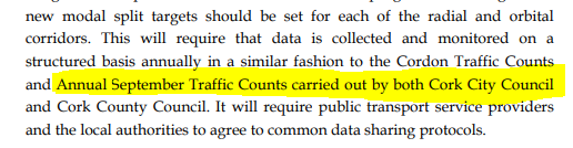 Monitoring and Evaluation Cork City Council does not actively monitor cyclist numbers at present. To measure progress in the objective of growing cycle mode share in Cork, a systematic traffic counting programme is needed to have accurate and timely data on cycling mode share. TFI traffic automatic traffic counters do not measure cyclists. In Dublin, the city council operate a small network of totem cyclist traffic counters , the data from which is available to the public on the data.gov.ie website. Evidence from other cities such as Copenhagen shows that the most accurate means of measuring cycling numbers is still a manual traffic counting programme conducted annually. In the past An Foras Forbeatha operated such a programme, see attached for reference . Cork City Council also used to conduct an Annual September traffic count. The 2008 CASP update , snapshot attached, called for the re-introduction of such a traffic counting programme. A manual and regular traffic counting programme , complemented by automatic cyclist counters that feed into the City Smart Gateway portal, is required in order to actively monitor progress in growing cycling mode share.