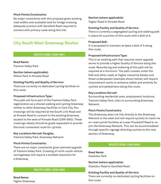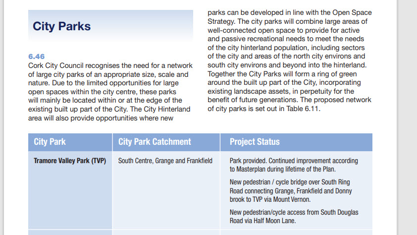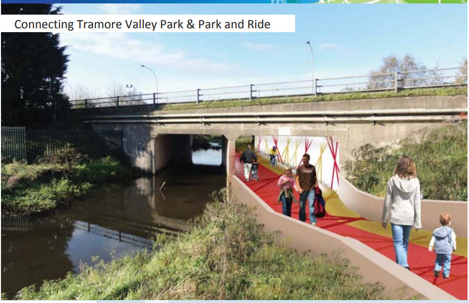 The Tramore valley Park currently has a pedestrian and cycling entrance from Douglas at Willow Park, a planned entrance at Half Moon rd, and recent approval of funding for a new €1.5 million pedestrian and cycling bridge from Grange.