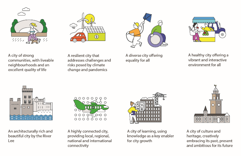 The Cork City Development Plan will provide the framework for shaping the future structure of the city for 2022 - 2028. To do this, the plan will need to be driven by a very clear set of principles, including those illustrated below.
