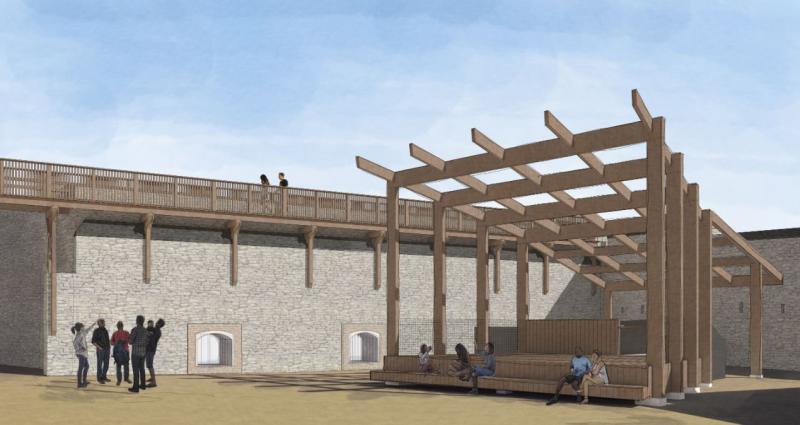 External Stage: Timber framed stage structure for a variety of outdoor cultural events (with removable waterproof covering) located to corner of existing 'parade area' within the Fort.