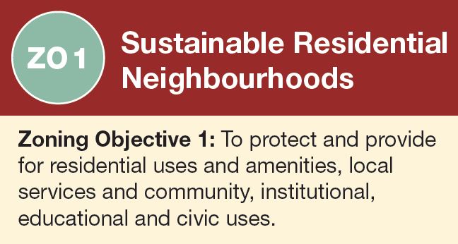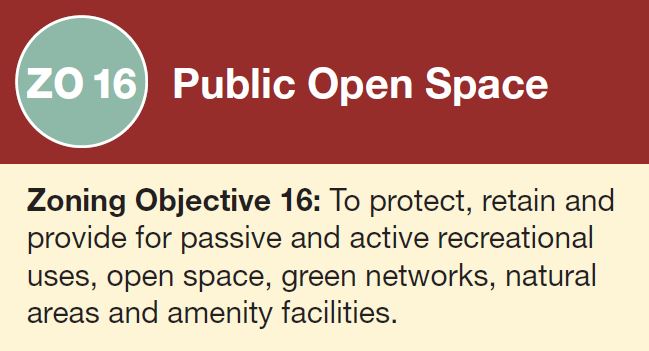 Many green areas in residential housing estates throughout the City function as public open spaces and amenity areas but are zoned ZO 1 Sustainable Residential Neighbourhoods (or another land use zoning objective). For zoning objectives relating to these areas, refer to ZO 1 Sustainable Residential Neighbourhoods above, and to the paragraph on ‘Open Space in Residential Areas’ above.