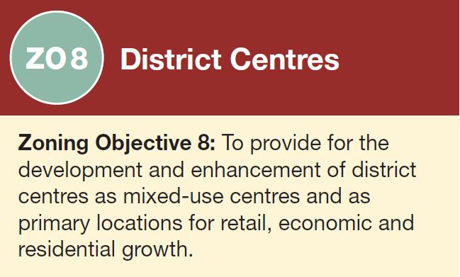 This zone applies to the urban and suburban district centres and are characterised by a mix of convenience and comparison retail and a wide range of services and other uses, usually serving a district of the city. District Centres act as a focus for a range of services, and together with the City Centre and Urban Town Centres they form part of an integrated strategy for mixed use compact growth in key locations of Cork City. Chapter 7 Economy and Employment sets out further objectives for District Centres.