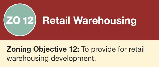 This purpose of this zoning objective is to provide for the sale of bulky goods as defined in the Joint Retail Strategy and Retail Planning Guidelines. Pure comparison or convenience retailing is not permitted in this zone. Ancillary small-scale local service uses (for example coffee shops) may be open for consideration subject to local considerations and an appropriate scale where they are subsidiary to the main retail warehousing uses and do not conflict with the primary zoning objectives.