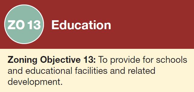 The main purpose of this zone is to provide for the wide range of education facilities, generally comprising primary and post primary schools and third-level education facilities. This zone accommodates all ancillary accommodation, facilities and development serving educational facilities, including sports facilities and playing fields and associated development.