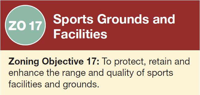 There is a presumption against the loss of land zoned Sports Grounds and Facilities to other forms of development. Only development that is ancillary to the principle use of the site for sports and which will only affect lands incapable of forming part of the playing pitches, courts, tracks, courses or similar, will be considered in these areas. Ancillary uses include other sport and leisure facilities such as clubhouses, changing rooms, meeting rooms, gyms, sports training halls, catering facilities, caretaker accommodation and appropriate car parking facilities. Crèches and community uses are open for consideration, provided they are linked to the sports use.