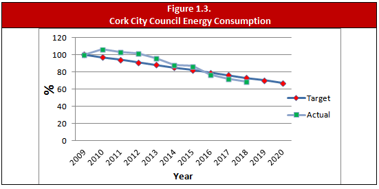 In 2009, Ireland developed The National Energy Efficiency Action Plan 2009-2020 (NEEAP). This NEEAP set an overall national goal of 20% improvement in energy efficiency by 2020, within which the public sector is committed to a 33% improvement in energy efficiency by 2020. By the end of 2018 Cork City Council achieved a 31.5% energy reduction and is on target to reach this 2020 target. Figure 1.3. shows the City Council’s progress towards reaching this target. Much of this success is a result of Cork City Council’s directorates carrying out energy efficient projects.