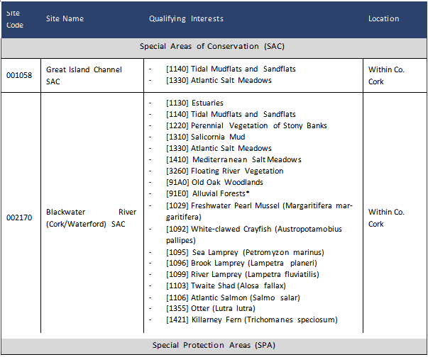 Cork Harbour SPA (4030) is a large, sheltered bay system, with several river estuaries - principally those of the Rivers Lee, Douglas, Owenboy and Owennacurra. The SPA site comprises most of the main intertidal areas of Cork Harbour, including all of the North Channel, the Douglas River Estuary, inner Lough Mahon, Monkstown Creek, Lough Beg, the Owenboy River Estuary, Whitegate Bay, Ringabella Creek and the Rostellan and Poul- nabibe inlets. Cork Harbour is an internationally important wetland site, regularly supporting in excess of 20,000 wintering waterfowl. Of particular note is that the site supports internationally important populations of Black- tailed Godwit and Redshank and nationally important number of 19 other wetland species. The Great Island Channel SAC (001058) stretches from Little Island to Midleton, with its southern boundary being formed by Great Island. It is an integral part of Cork Harbour which contains several other sites of conservation interest. Geologically, Cork Harbour consists of two large areas of open water in a limestone basin, separated from each other and the open sea by ridges of Old Red Sandstone. Within this system, Great Island Channel forms the eastern stretch of the river basin and, compared to the rest of Cork Harbour, is relatively undisturbed. Within the site is the estuary of the Owennacurra and Dungourney Rivers, these rivers, which flow through Mid- leton, provide the main source of freshwater to the North Channel. The main habitats of conservation interest are the sheltered tidal sand and mudflats and the Atlantic salt meadows. Owing to the sheltered conditions, the intertidal flats are composed mainly of soft muds. These muds support a range of macro-invertebrates, notably Macoma balthica, Scrobicularia plana, Hydrobia ulvae, Nepthys hombergi, Nereis diversicolor and Corophium volutator. Green algal species occur on the flats, especially Ulva lactua and Enteromorpha spp. The River Blackwater SAC (002170) to the north and east of Cork City Council boundary and is an area of peaty terrain in the upper reaches of the river and of some of the tributaries gives the water a pronounced dark colour. The SAC consists of the freshwater stretches of the River Blackwater as far upstream as Ballydesmond, the tidal stretches as far as Youghal Harbour and many tributaries, the larger of which include the Licky, Bride, Flesk, Chimneyfield, Finisk, Araglin, Awbeg (Buttevant), Clyda, Glen, Allow, Dalua, Brogeen, Rathcool, Finnow, Ow- entaraglin and Awnaskirtaun. The portions of the Blackwater and its tributaries that fall within this SAC flow through the counties of Kerry, Cork, Limerick, Tipperary and Waterford. Nearby towns include Rathmore, Mill- street, Kanturk, Banteer, Mallow, Buttevant, Doneraile, Castletownroche, Fermoy, Ballyduff, Rathcormac, Tallow, Lismore, Cappoquin and Youghal. This SAC is designated for a range of habitat types and is of considerable conservation significance for the occurrence of good examples of habitats and populations of plant and animal species that are listed on Annexes I and II of the E.U. Habitats Directive respectively and thertance of the site is enhanced by the presence of a suite of uncommon plant species.