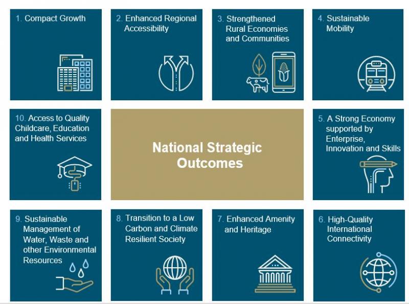 Project Ireland 2040 is the Government’s long-term overarching strategy to ‘make Ireland a better country for all of its people’. This comprises the National Development Plan 2018-2027 and the National Planning Framework (NPF) – a high-level strategy to guide development and investment in Ireland up to 2040. Project Ireland 2040 sets ambitious growth targets for Cork City based on a vision of a regional strategy to provide a counterbalance to Dublin. The NPF sets out ten National Strategic Outcomes, which form the basis for this Plan.