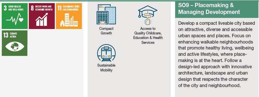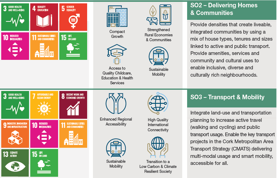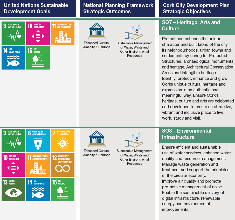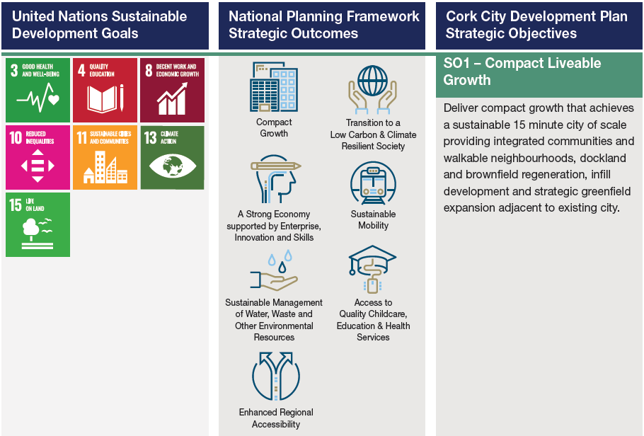 This Plan sets out 9 Strategic Objectives to guide development in the City. These Strategic Objectives generally reflect the various Chapters set out in this Plan and are addressed in Chapter 2. However, the following tables set out how these 9 Strategic Objectives align with the United Nations Sustainable Development Goals and the National Strategic Outcomes of the National Planning