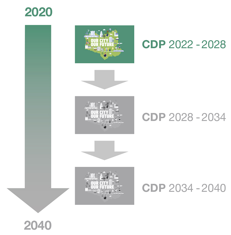 This City Development Plan is the key land use and strategic planning strategy to guide the development of Cork City to achieve this strategic vision. The City Development Plan 2022 – 2028 will be the first development plan of a three-plan cycle up to 2040, the horizon year of the National Planning Framework. This Plan therefore represents the first step in achieving the ambitions of the National Planning Framework.