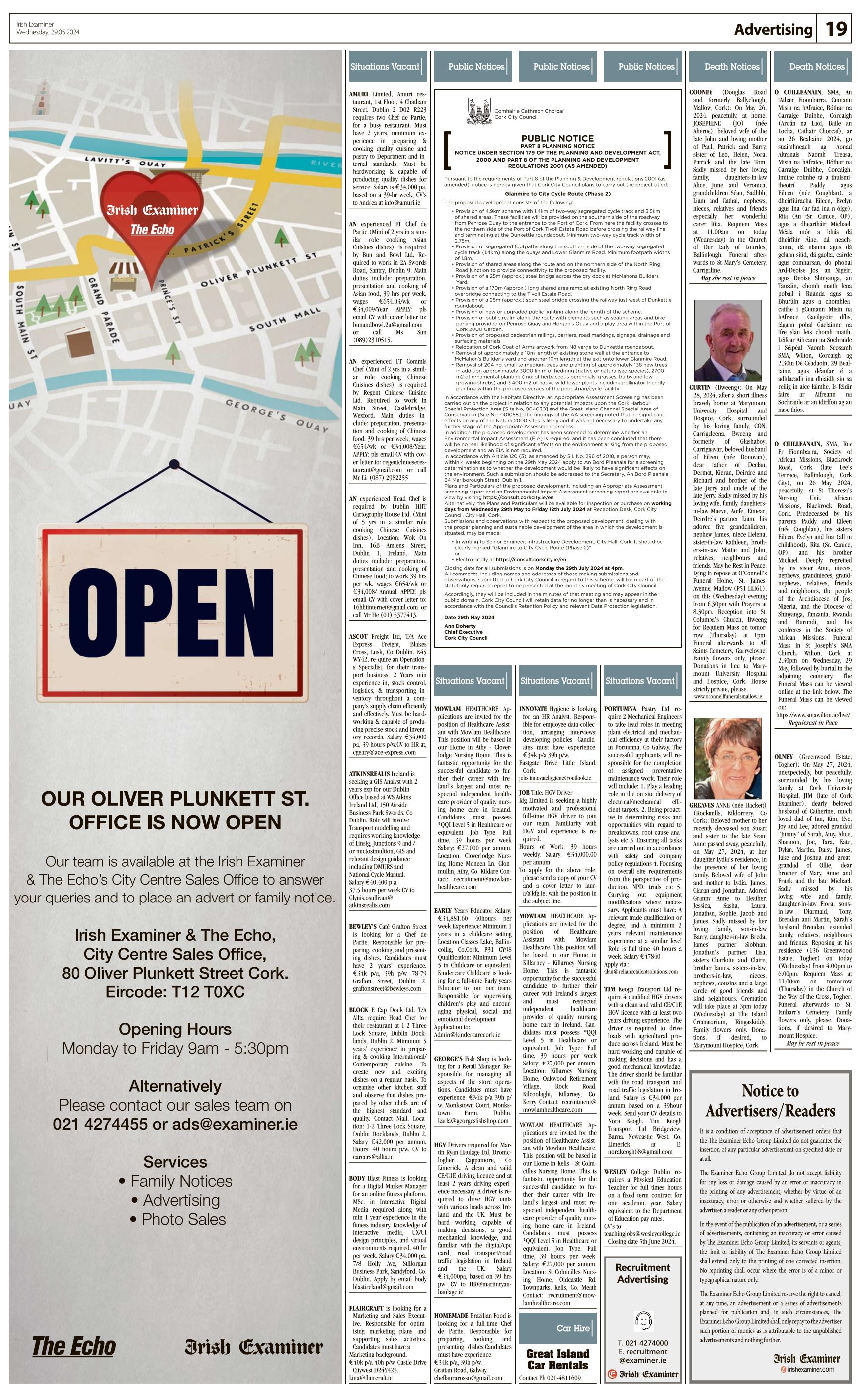 Alternatively, the Plans and Particulars will be available for inspection or purchase on working days from Wednesday 29th May to Friday 12th July 2024 at Reception Desk, Cork City Council, City Hall, Cork.